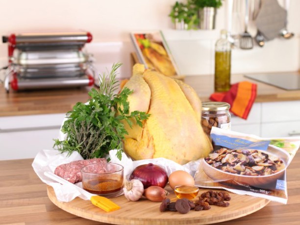 - Pour la farce : 300g de chair à saucisse, 100g de foies de volaille, 150g de marrons cuits, 1 pomme, une poignée de morilles séchées.